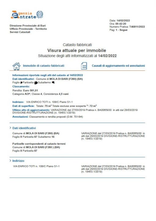 La visura catastale per immobile ordinaria rappresenta la situazione dell’immobile aggiornata secondo l’ultimo caricamento dell’Agenzia delle Entrate.