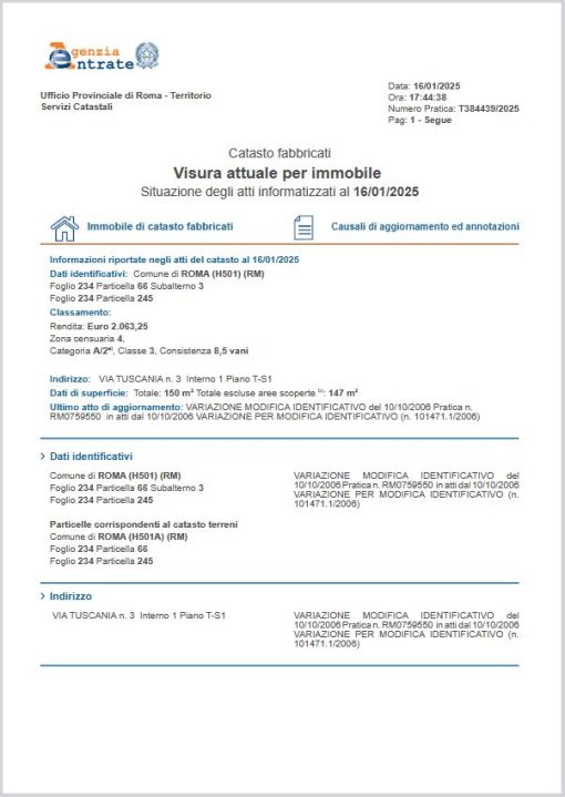 Le variazioni indicate nella Visura Storica Roma possono essere: passaggi di proprietà con le indicazioni delle volture, variazioni di destinazione d’uso o aggiornamenti della rendita catastale.